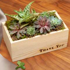 Send a garden full of gratitude with an arrangement of lush succulents. Hardy and easy to care for, assorted succulents are expertly planted in a hand crafted wood trough branded "Thank You." Measures approximately 8'' x 5'' x 6" to top of arrangement. Requires 2nd day shipping.