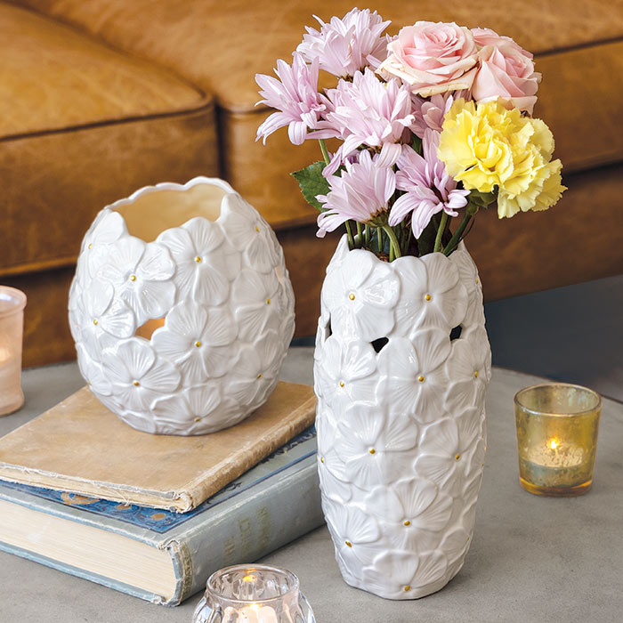 NEW! Whether displaying your own flowers or glowing candles, our Ceramic Hydrangeas Vase Set is a modern classic. Crafted of ceramic in the shape of overlapping flowers with gilt centers, vases measure approximately 5" x 6" and 4" x 8 ½". Set of 2 vases arrives packaged together in Olive & Cocoa® gift wrap with ribbon.