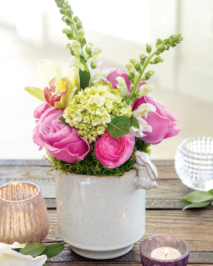 NEW! Share the gorgeous hues of the season in distinct springtime style. Brimming with pink and green blossoms, our ceramic potager has a speckled finish and a charming hare perched on the rim. Climbing Bunny Potager measures 5" in diameter by 12" to top of arrangement and requires next day shipping.