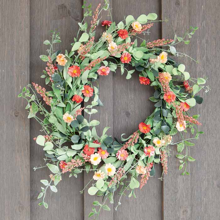 Beautiful throughout every changing season, our Coral & Eucalyptus Wreath is a rare find. A gathering of everlasting orange, pink, and white florals blossom among an arrangement of faux green leaves and shoots. Measuring approximately 18" in diameter, wreath arrives adorned with a fluffy signature Olive & Cocoa® satin bow.