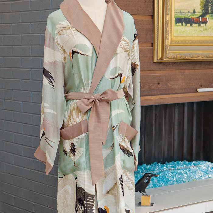 Painterly cranes gracefully spread their wings on our exquisite Crowned Crane Robe. Woven of the softest blend for a shantung-like look and feel, our robe is sure to be an instant favorite. Finished with front pockets, belted robe is women’s one size fits most and arrives gift wrapped in a hand crafted wood crate with ribbon.