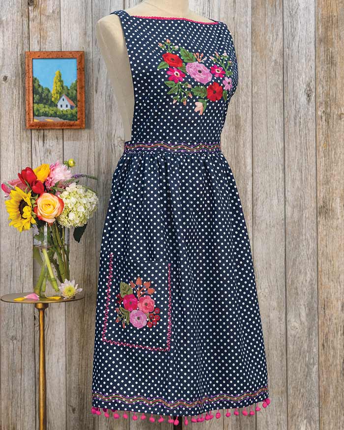 NEW! Whimsical yet timeless, our Dot & Flora Embroidered Apron adds fashionable flair to her culinary adventures. 100% cotton apron has a polka dotted field with gorgeous floral embroidery and contrasting mini pom trim. Complete with adjustable neck and waist ties, apron measures approximately 36" long and arrives gift wrapped in a hand crafted wood crate with ribbon.