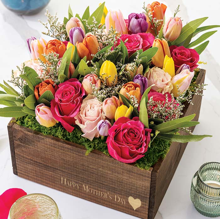 An evocative tribute to the sprawling flower fields of Europe, our English Tulip Garden juxtaposes a jubilee of tulips with roses and fresh botanicals. Artfully arranged in a dark stained hand crafted wood box branded "Happy Mother's Day," English Tulip Garden measures approximately 10" x 10" x 9" to top of arrangement and requires next day shipping.
