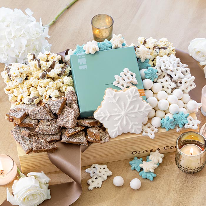 NEW! Elegant as well as mouthwatering, our Falling Snow Delights crate is a holiday delight. Petite includes a snowflake decorated cookie, snowflake pretzels, glittery snowflake gummies, yogurt malt balls, and rocky road popcorn. Medium adds a full pound of gourmet almond toffee. Large adds extra snowflake gummies and rocky road popcorn. Each size arrives gift wrapped in a hand crafted wood crate with ribbon.