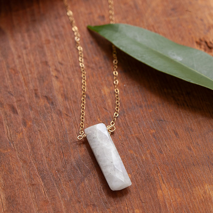 An intriguing moonstone dangles from a golden chain to add a mystical element to her style. Measuring approximately 1" long, faceted moonstone pendant is complemented by a 17" long gold filled chain with a spring ring closure. Moonstone Bar Necklace arrives gift wrapped in a hand crafted wood crate with ribbon.