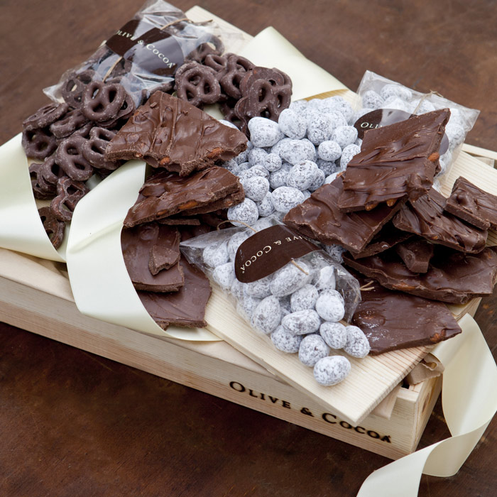 Chic chocolate sweets are a blissfully sweet Easter tradition. Send decadent spring wishes with a grand collection that includes a pound each of milk chocolate pretzels, chocolate almond bark, and dusted toffee almond Easter eggs. Chocolates come gift wrapped together in a hand crafted wood crate with ribbon.