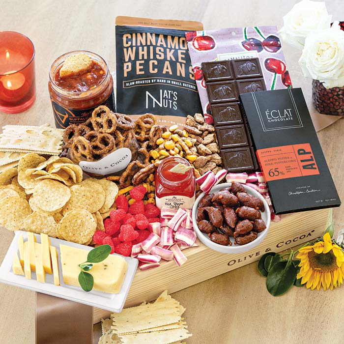 NEW! Send their taste buds a kaleidoscope of flavors with our Sweet, Savory & Spicy collection. Petite includes spicy cherry candies, hot pepper cheese, spicy trail mix, churro pretzels, and black pepper crackers. Medium adds chorizo bites, cinnamon hearts, corn & bean salsa, and tortilla chips. Large adds red pepper jelly, cinnamon whiskey pecans, and an Aleppo pepper chocolate bar. Each size arrives gift wrapped in a hand crafted wood crate with ribbon.